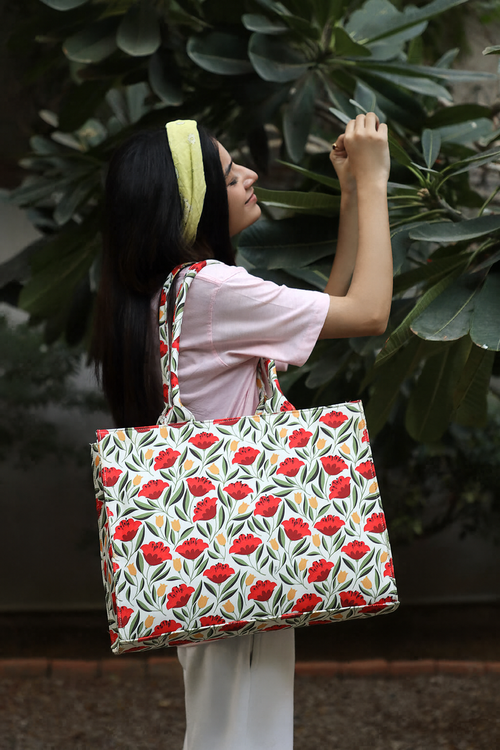 Tote Bag in canvas fabric with zip closure. Single compartment, two hand carry handles
