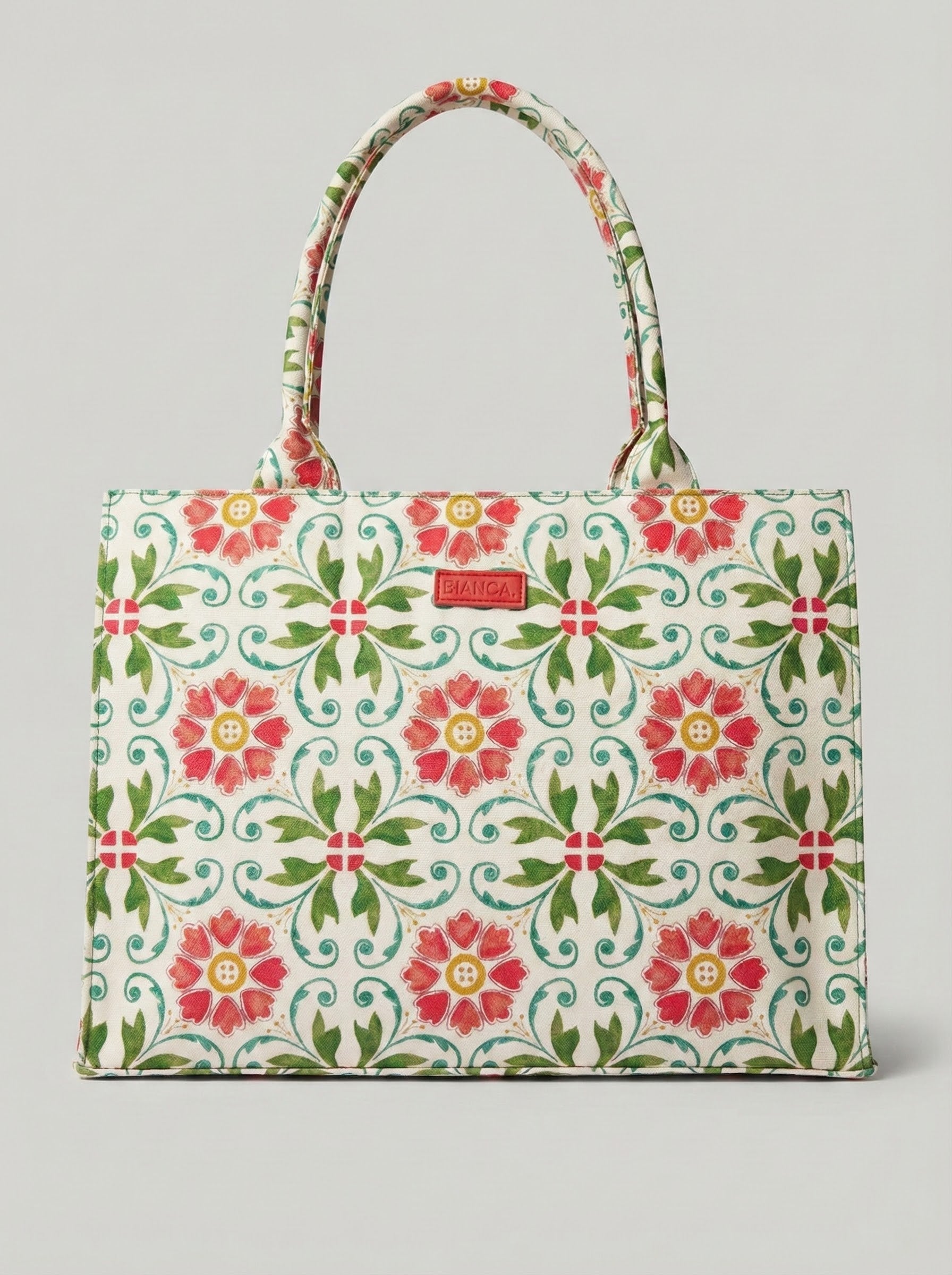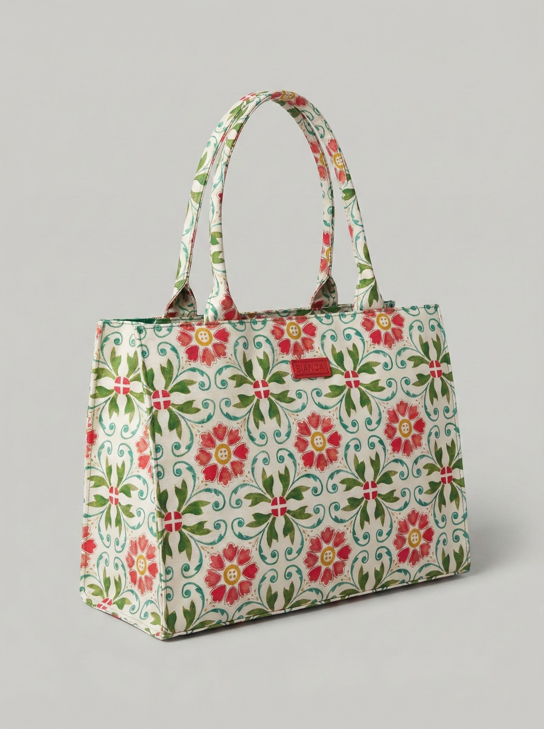 Tote Bag in canvas fabric with zip closure. Single compartment, two hand carry handles